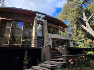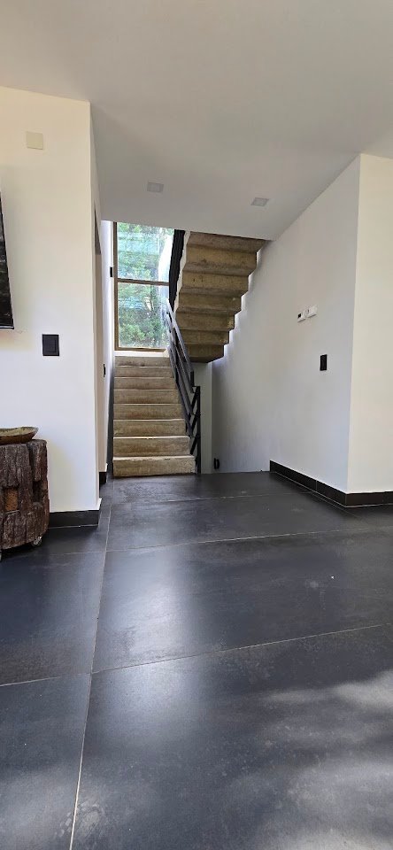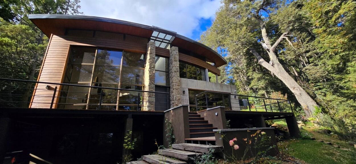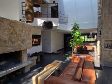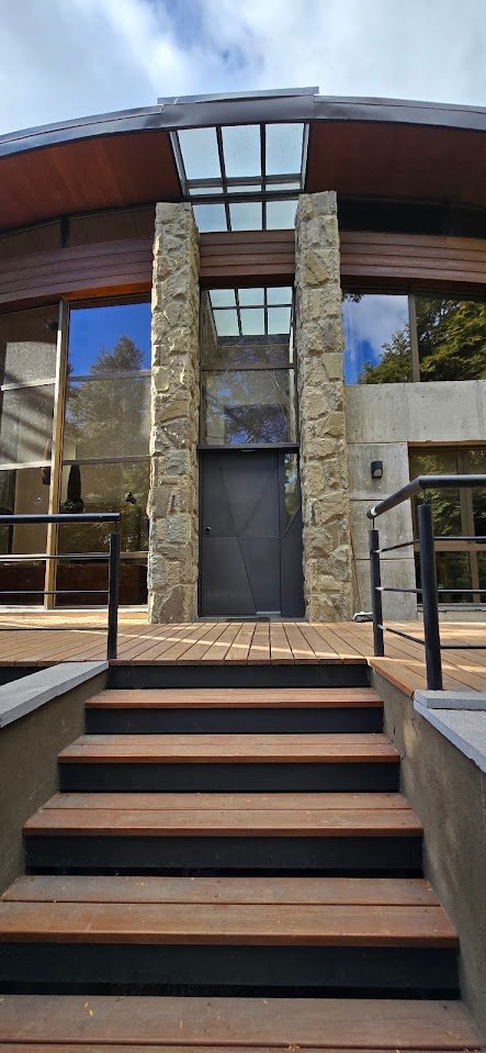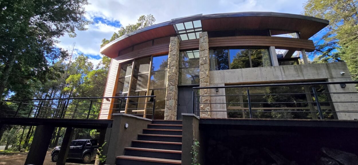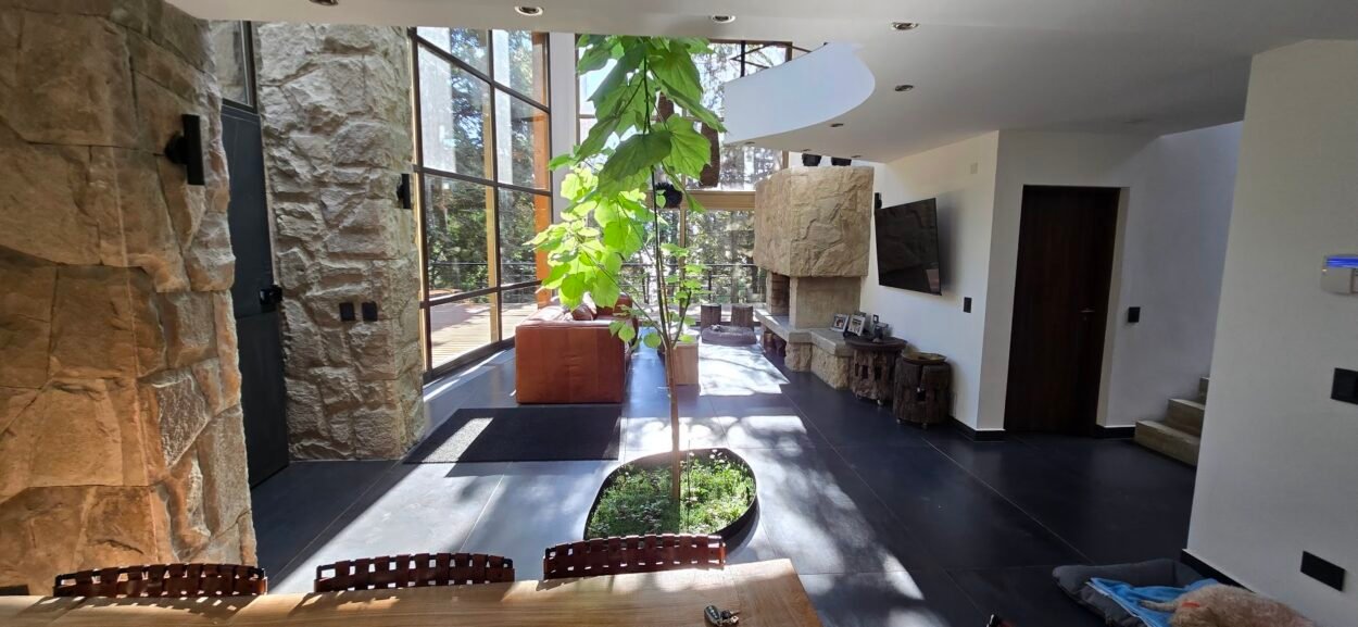 Organizada a partir de un frente curvo y una doble altura en el estar, esta hermosa casa posee un jardín central verde, donde se vinculan los distintos ambientes de la misma logrando gran espacialidad . Iluminada cenitalmente con una cubierta de vidrio y materializada en Hormigón y piedra mantiene la imagen de una vivienda rustica, moderna, natural y de diseño.