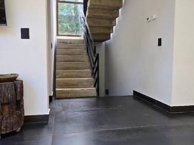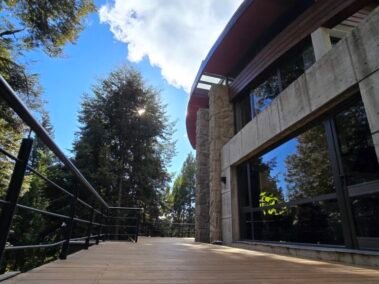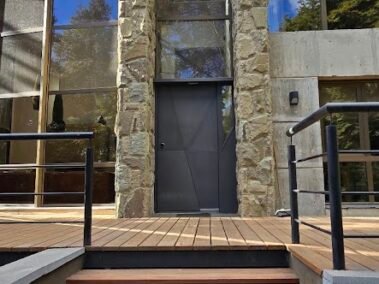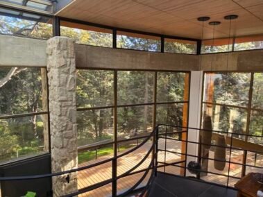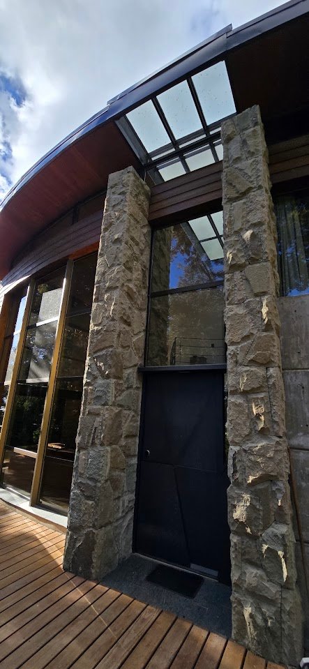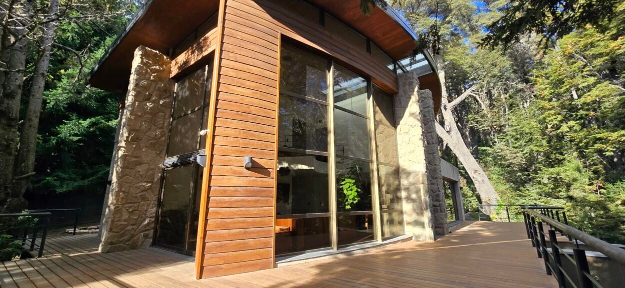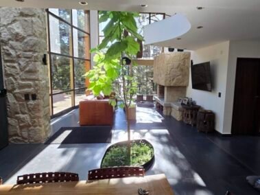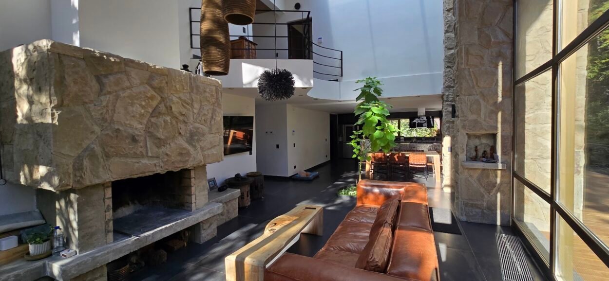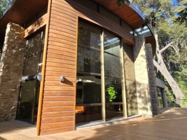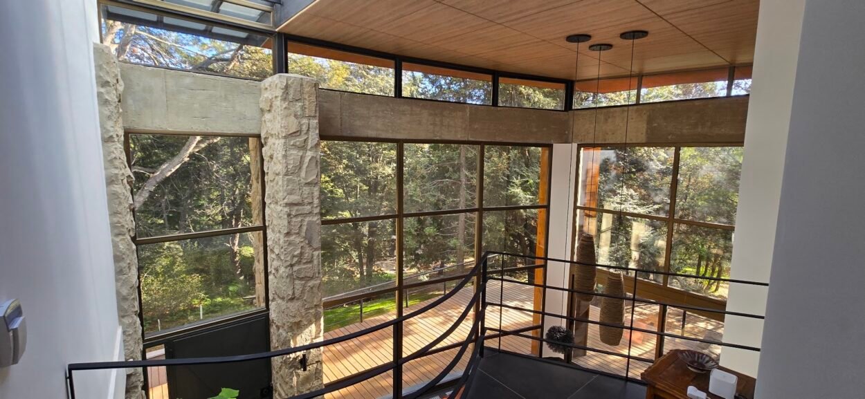 Organizada a partir de un frente curvo y una doble altura en el estar, esta hermosa casa posee un jardín central verde, donde se vinculan los distintos ambientes de la misma logrando gran espacialidad . Iluminada cenitalmente con una cubierta de vidrio y materializada en Hormigón y piedra mantiene la imagen de una vivienda rustica, moderna, natural y de diseño.