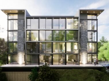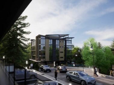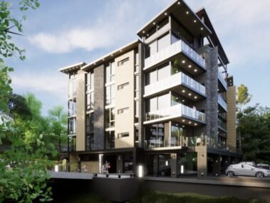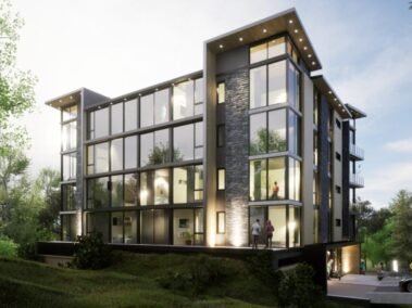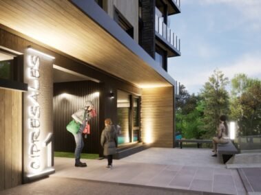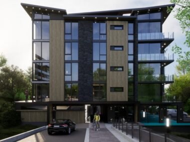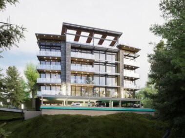 Dentro de un complejo de mas de 10.000m2, se encuentra este edificio de líneas dinámicas, con largos balcones y voladizos, con un juego de techos y planos, genera un edificio que define la arquitectura patagónica de montaña moderna y el mayor confort y diseño, rodeado de bosque de cipreses y disfrutando de una vista única al lago Nahuel Huapi.