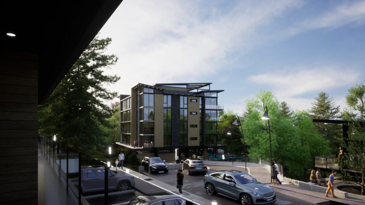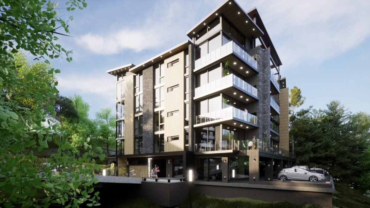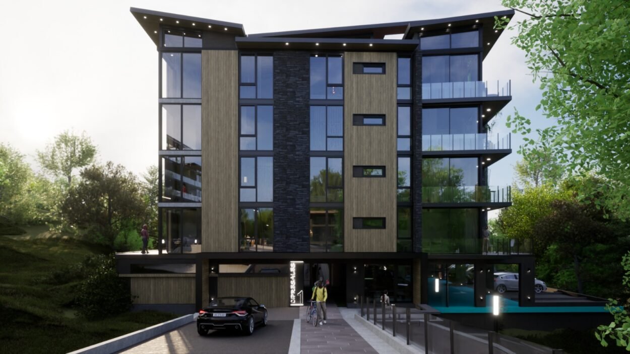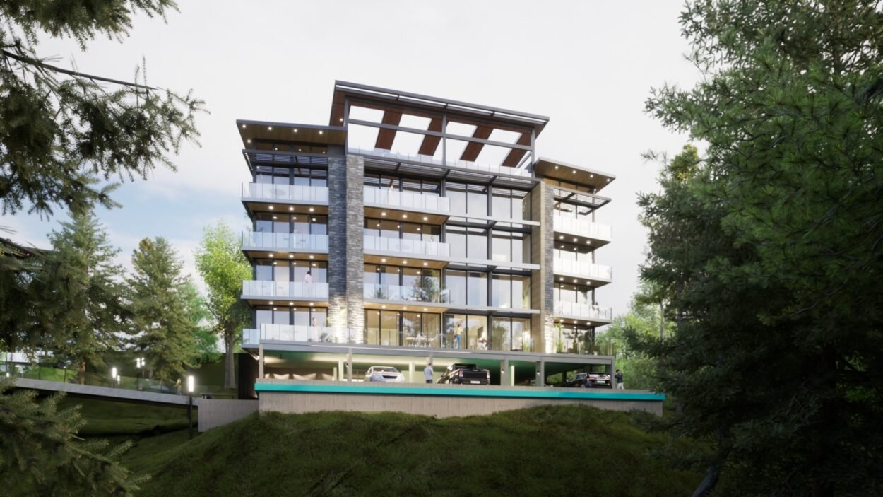 Dentro de un complejo de mas de 10.000m2, se encuentra este edificio de líneas dinámicas, con largos balcones y voladizos, con un juego de techos y planos, genera un edificio que define la arquitectura patagónica de montaña moderna y el mayor confort y diseño, rodeado de bosque de cipreses y disfrutando de una vista única al lago Nahuel Huapi.