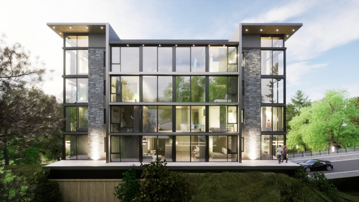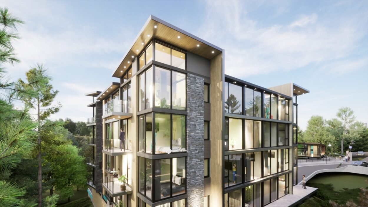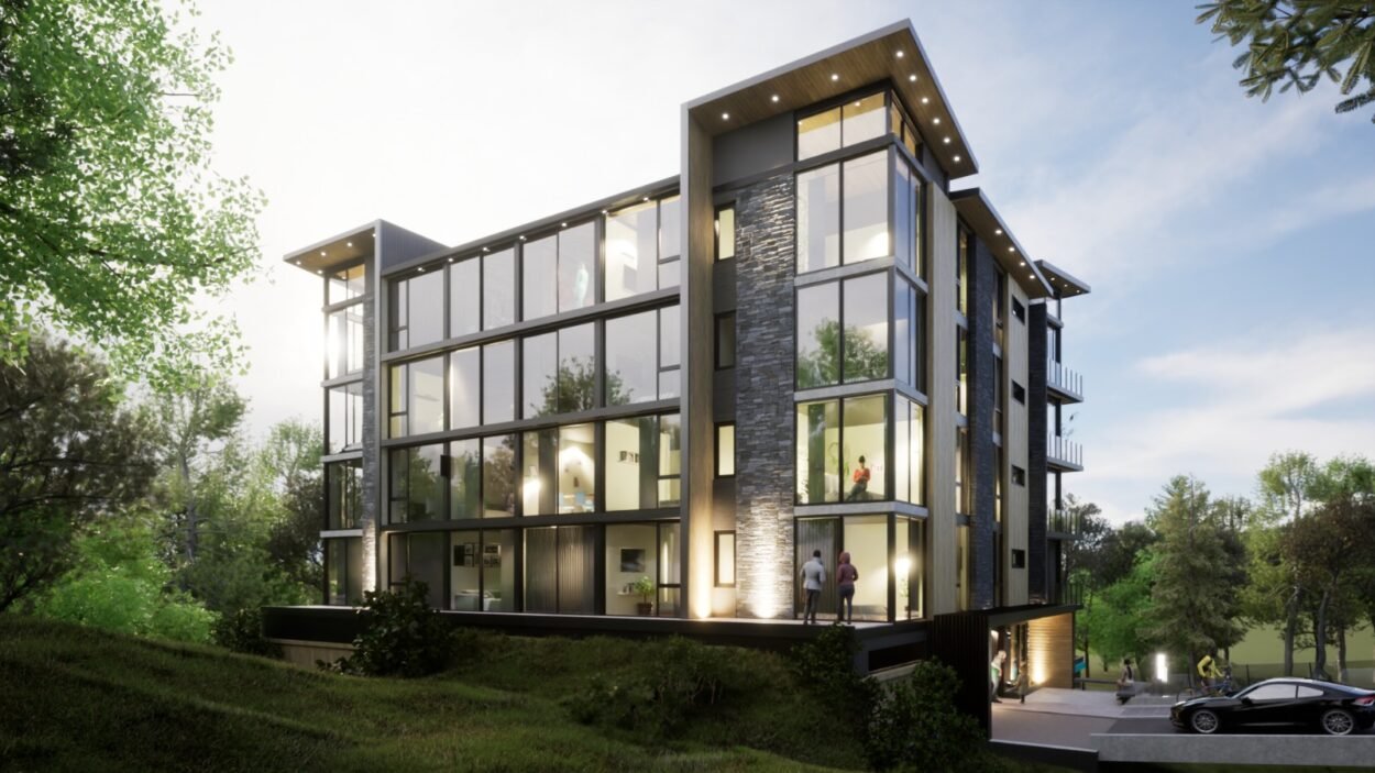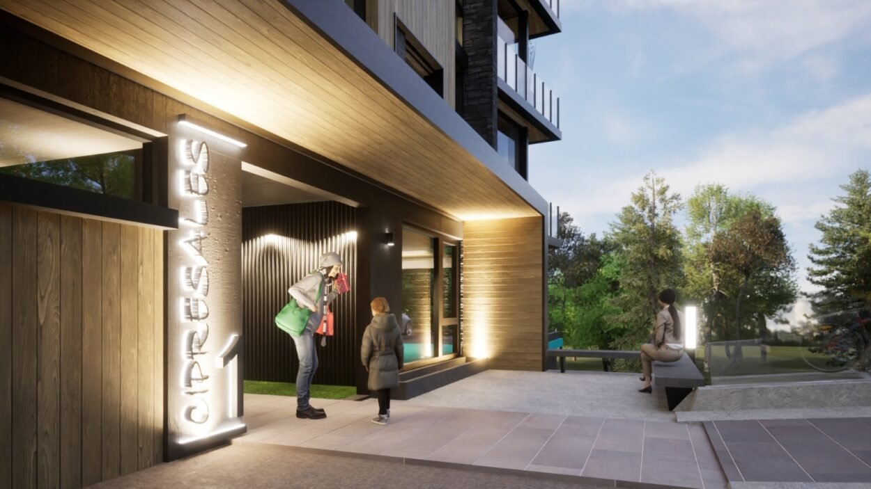 Dentro de un complejo de mas de 10.000m2, se encuentra este edificio de líneas dinámicas, con largos balcones y voladizos, con un juego de techos y planos, genera un edificio que define la arquitectura patagónica de montaña moderna y el mayor confort y diseño, rodeado de bosque de cipreses y disfrutando de una vista única al lago Nahuel Huapi.