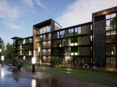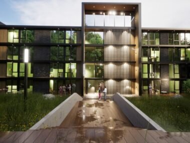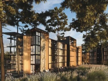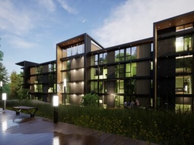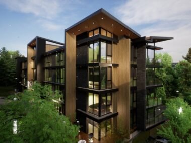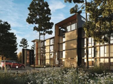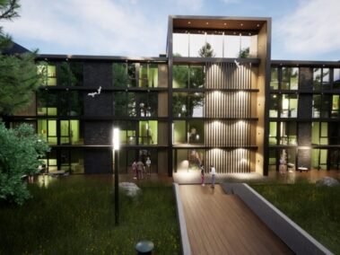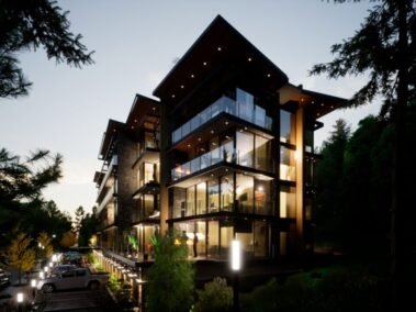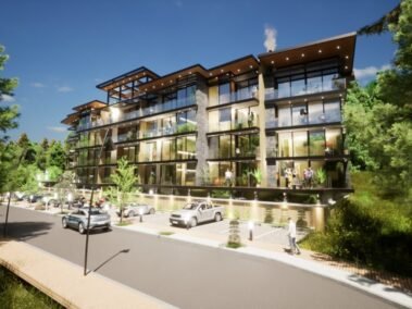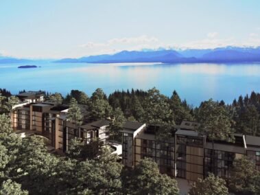 Dentro de un complejo de más de 10.000m2, se encuentra este edificio de líneas dinámicas, con largos balcones y voladizos, con un juego de techos y planos, genera un edificio que define la arquitectura patagónica de montaña moderna y el mayor confort y diseño, rodeado de bosque de cipreses y disfrutando de una vista única al lago Nahuel Huapi.