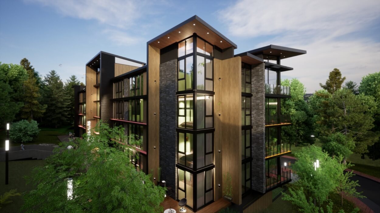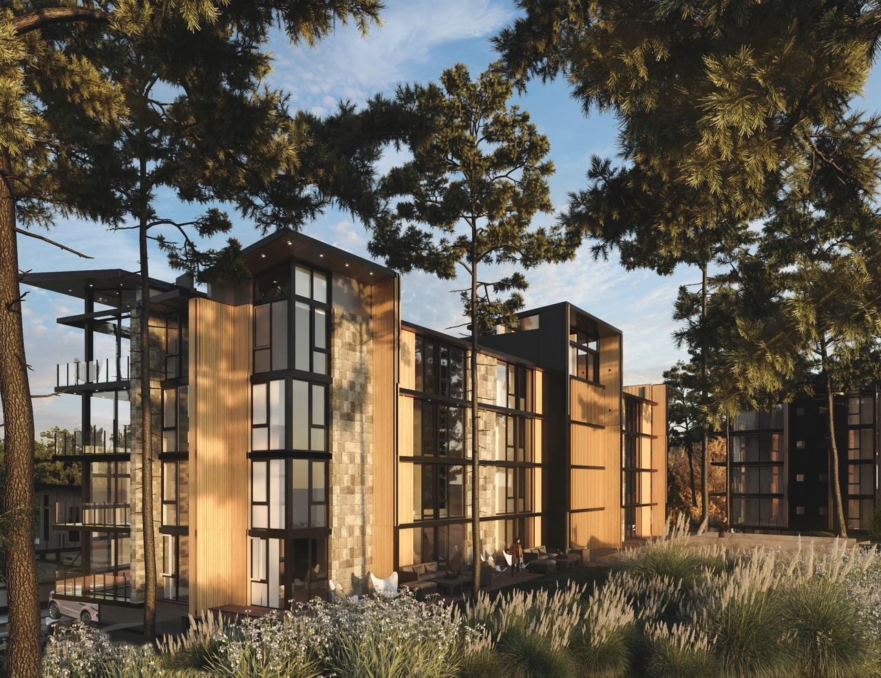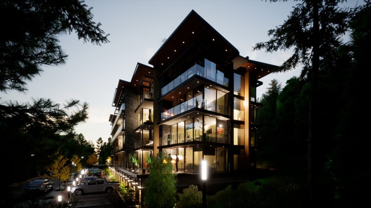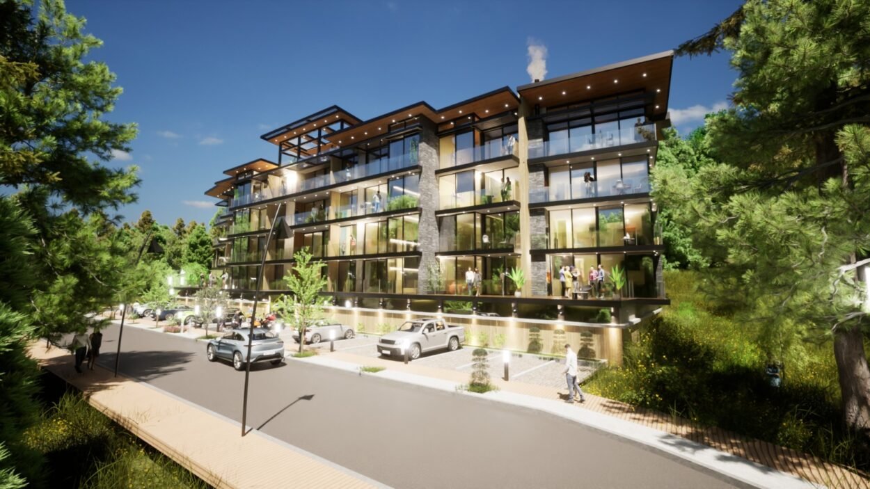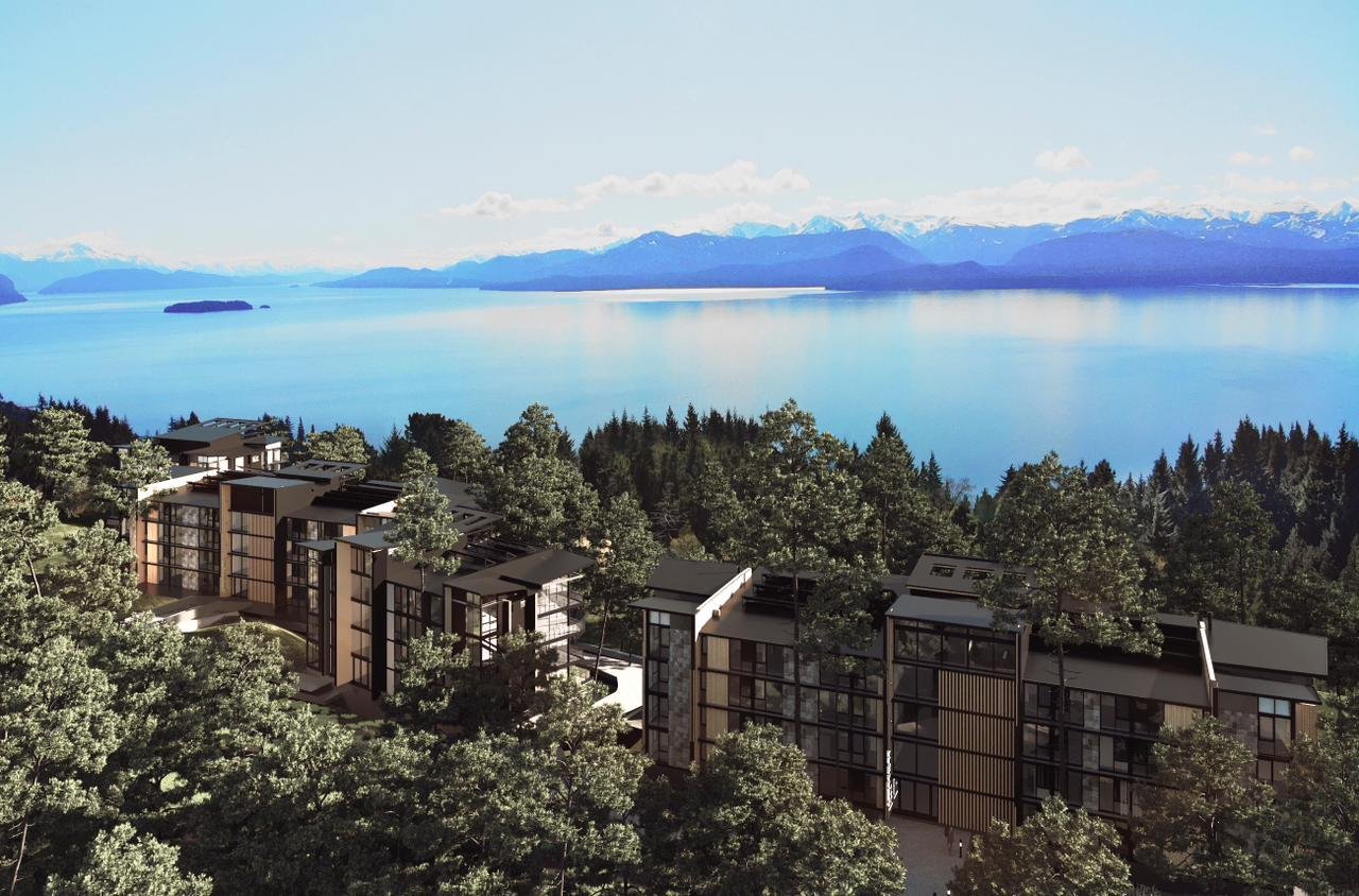 Dentro de un complejo de más de 10.000m2, se encuentra este edificio de líneas dinámicas, con largos balcones y voladizos, con un juego de techos y planos, genera un edificio que define la arquitectura patagónica de montaña moderna y el mayor confort y diseño, rodeado de bosque de cipreses y disfrutando de una vista única al lago Nahuel Huapi.