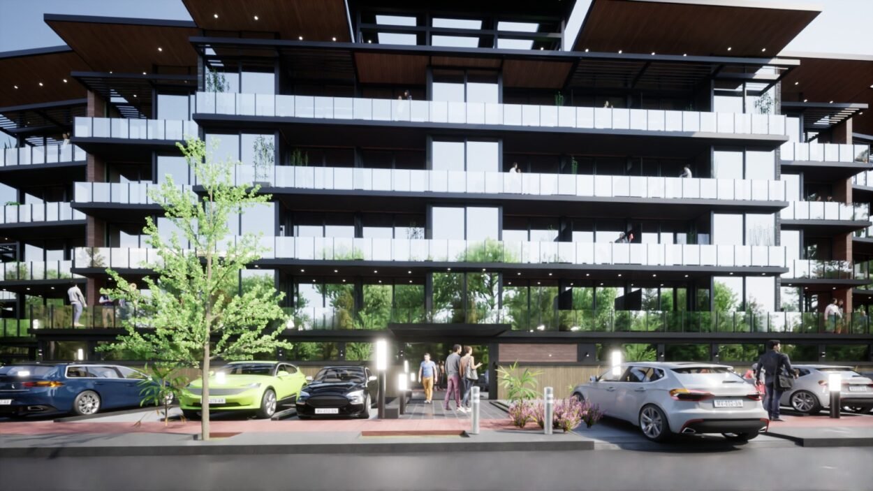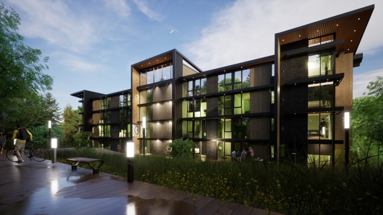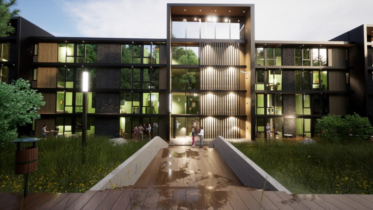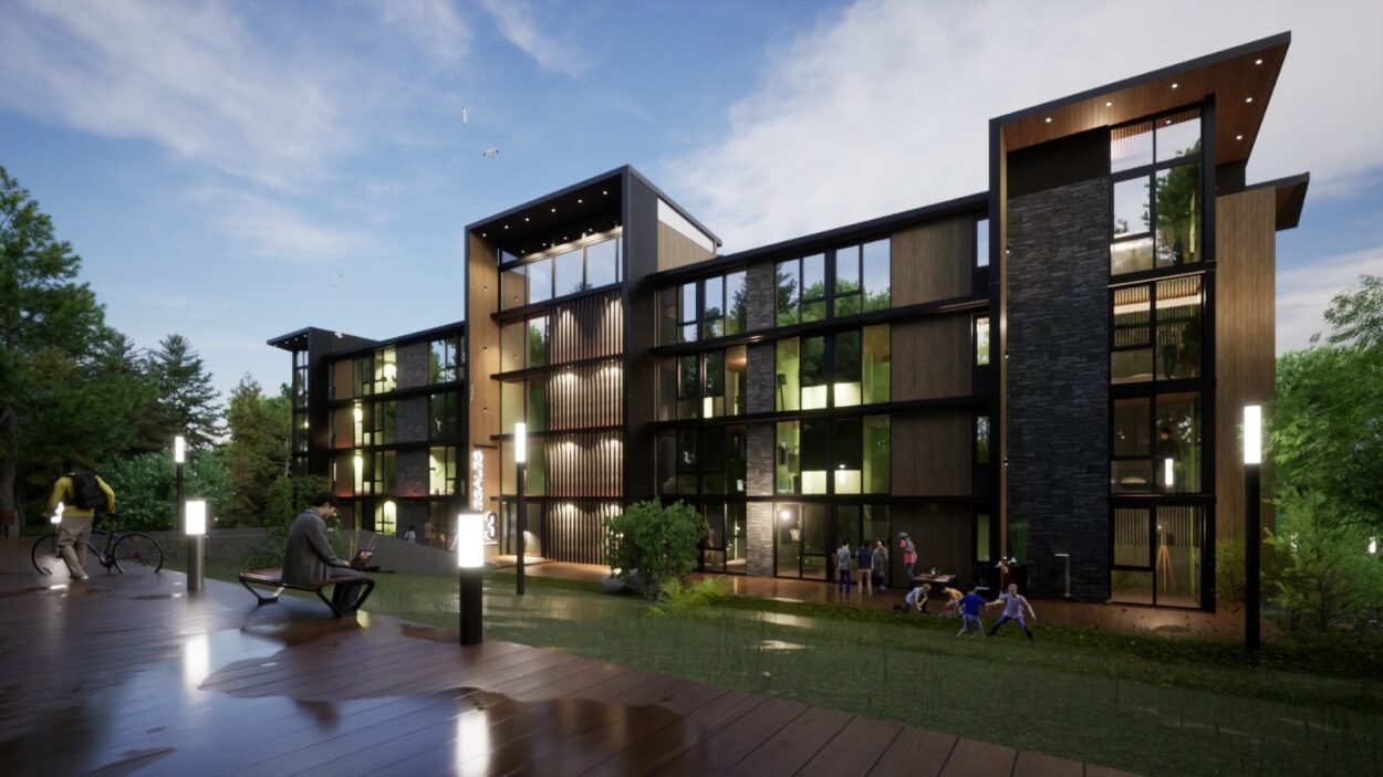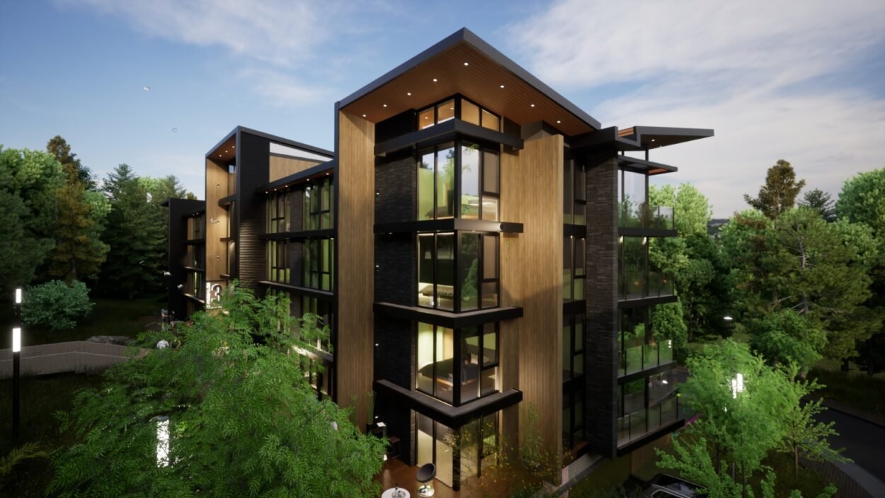 Dentro de un complejo de más de 10.000m2, se encuentra este edificio de líneas dinámicas, con largos balcones y voladizos, con un juego de techos y planos, genera un edificio que define la arquitectura patagónica de montaña moderna y el mayor confort y diseño, rodeado de bosque de cipreses y disfrutando de una vista única al lago Nahuel Huapi.